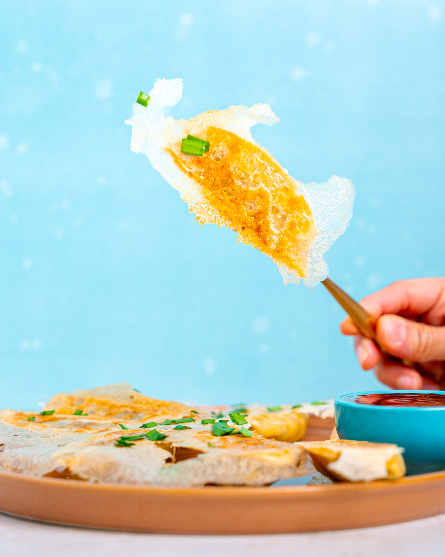 5. Finish and Serve - Remove the lid and cook for a further 1–2 minutes to crisp up any remaining moisture. The skirt should be golden, lacy, and crispy. Loosen with a spatula and carefully flip onto a serving plate skirt-side up. Serve immediately with the dipping sauce.